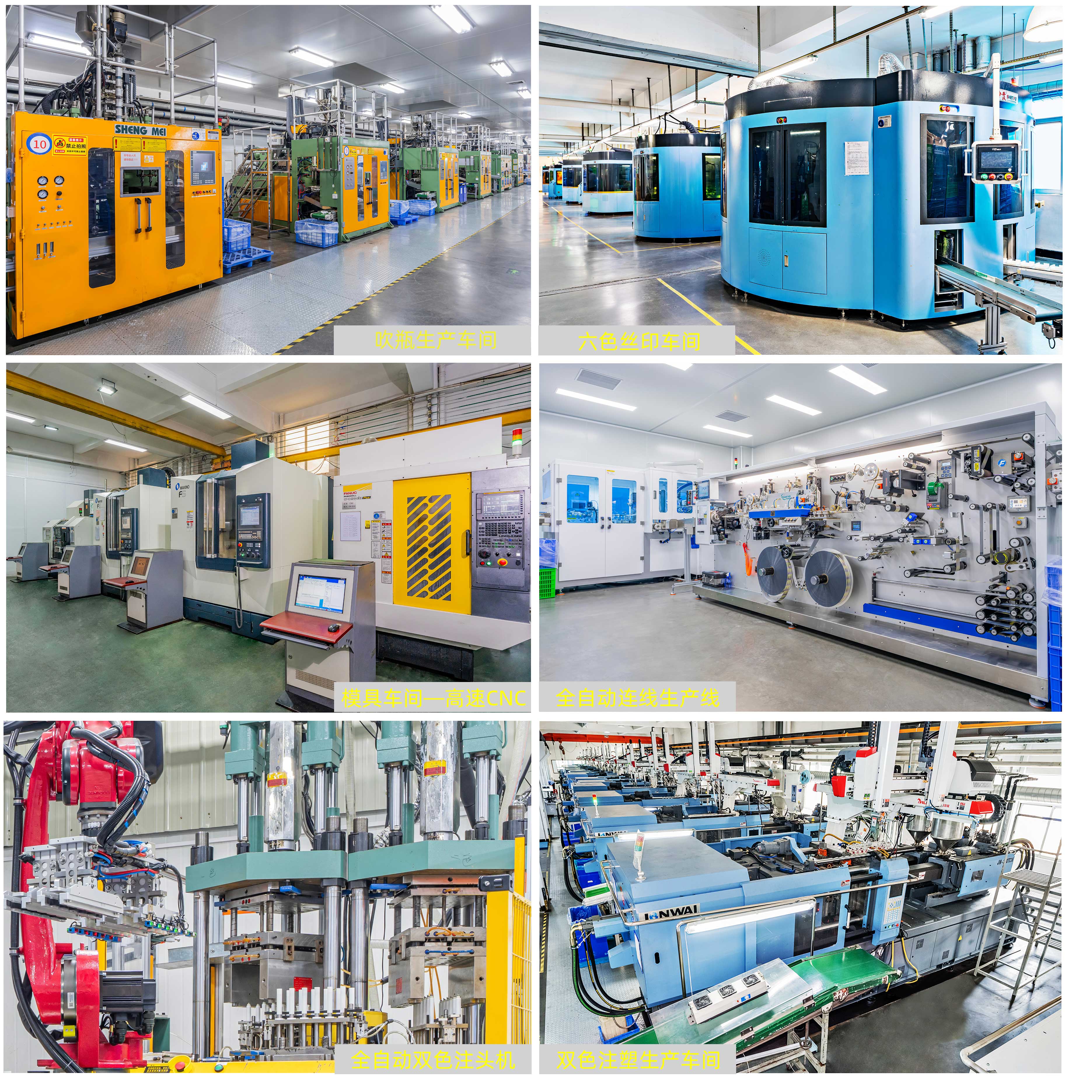 Huihong Production Base is located in Area A of the Science and Technology Industrial Park in Shishan Town, Nanhai District, Foshan City, Guangdong Province. Adjacent to the new Guangfo High-Speed Rail Hub at Foshan West Station, it enjoys convenient transportation. The factory covers an area of 33 acres with a plant floor space of 35,000 square meters. The mold department is equipped with multiple CNC (high-speed), EDM (mirror finish), CNC lathes, and automatic mold matching machines, along with imported Japanese precision mold-making equipment and Hexagon high-precision coordinate measuring machines. It adopts an advanced ERP production management system and has introduced multiple fully automated smart robotic production lines. The plastic mold monthly production capacity exceeds 30 sets. The production department operates six fully plastic hose production lines with a monthly output of over 10 million hoses; three sheet material production lines with a monthly output of 6 million; and more than 60 large injection molding machines, including 17 double-color injection molding machines, achieving a monthly output of 45 million lids. Additionally, there are five five-layer bottle blow molding machines, five high-speed blow molding machines, and a monthly plastic bottle production capacity of 6 million; seven tricolor and six-color screen printing machines with a monthly output of 14 million print runs.
